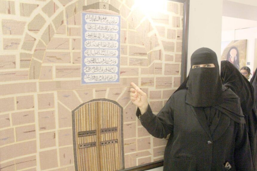الفنانة هيجه البلوي تقف بجوار لوحتها التي تمثل بوابة قلعة تبوك التاريخية في البلدة القديمة مطرزة بالخيوط والغرزة الصليبية بمعرض فن الرسم بالتطريز. (تصوير: علي بدير)