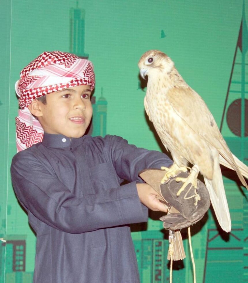 الطفل متعب الرشيدي، خلال مشاركته في أحد أندية الصقور بتبوك، التي تعمل على استعادة تلك الهواية وإحيائها في نفوس الأجيال الجديدة، لتربطهم بتراثهم وتعمّق هويتهم عبر تلك الهواية التراثية العريقة. (تصوير: علي بدير)