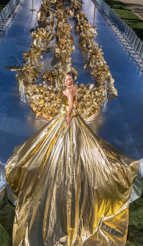 في إطلالة خارجة عن المألوف وسابقة لقواعد فساتين الزفاف التقليدية، تألقت عروس لبنانية بفستان ذهبي مبهر من توقيع المصمم كريكور جابوتيان، جسّد رؤية جريئة وعصرية للعروس الحديثة. التصميم الذهبي اللامع من الرأس حتى أخمص القدمين كان بمثابة بيان بصري فريد، يعكس قوة الشخصية والتميز، ويجمع بين الفخامة العالية والجرأة المطلقة.