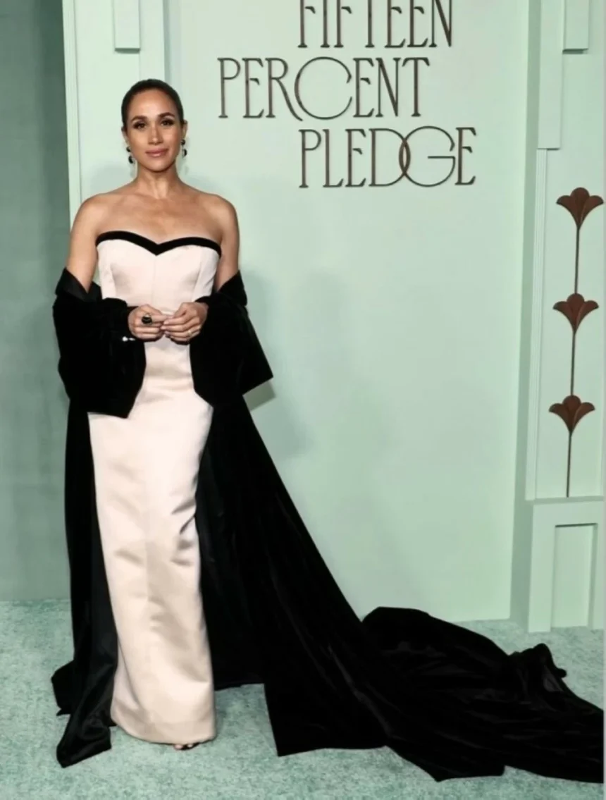 ظهرت ميغان ماركل في إحدى الفعاليات الخيرية بإطلالة اتسمت بالرقي والبساطة المدروسة، إذ اختارت فستاناً من الساتان باللون الأبيض جاء بتصميم مكشوف الكتفين، ما منح الإطلالة طابعاً أنثوياً ناعماً يعكس أسلوبها المعروف بالهدوء والأناقة الكلاسيكية. القماش اللامع أضفى حضوراً لافتاً دون مبالغة، بينما ساهم القصّ البسيط في إبراز رشاقتها ومنح الإطلالة توازناً بين الفخامة والعفوية.