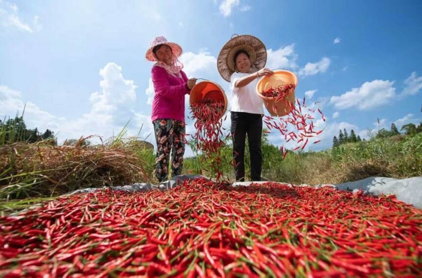 تتمتع مدينة زونيي، بمقاطعة قويتشو الصينية بوفرة في أشعة الشمس وتربتها الغنية بالزنك والسيلينوم؛ ما يثمر عن محصول فلفل يحظى بإقبال كبير في السوق حالياً. وفي الصورة عاملتان أثناء حصاد محصول الفلفل بالمقاطعة. (إيكونومي دايلي الصينية).