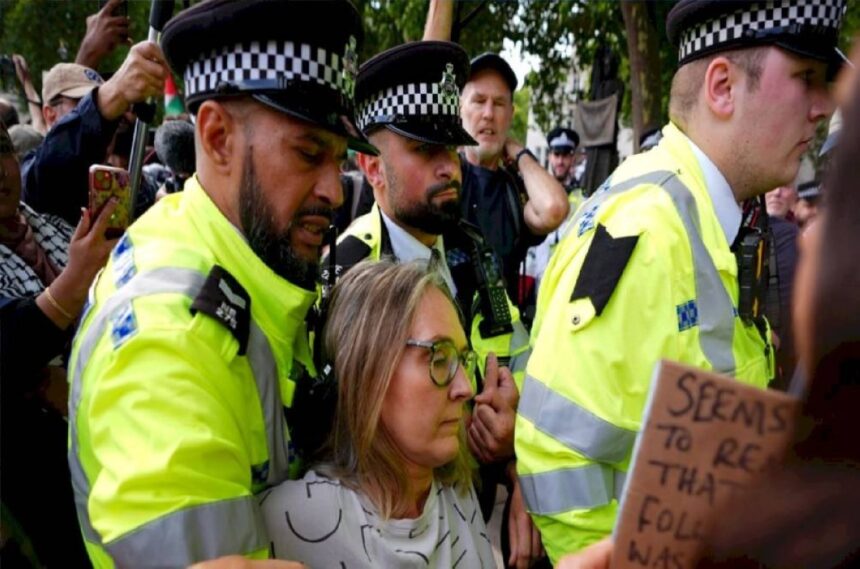 اعتقلت الشرطة البريطانية 890 شخصاً خلال احتجاج، أقيم أمس (السبت)، ضد قرار تصنيف حركة «فلسطين أكشن» منظمة إرهابية، بينهم 17 شخصاً بتهمة الاعتداء على عناصر الشرطة، بحسب ما أعلنته شرطة لندن اليوم (الأحد).