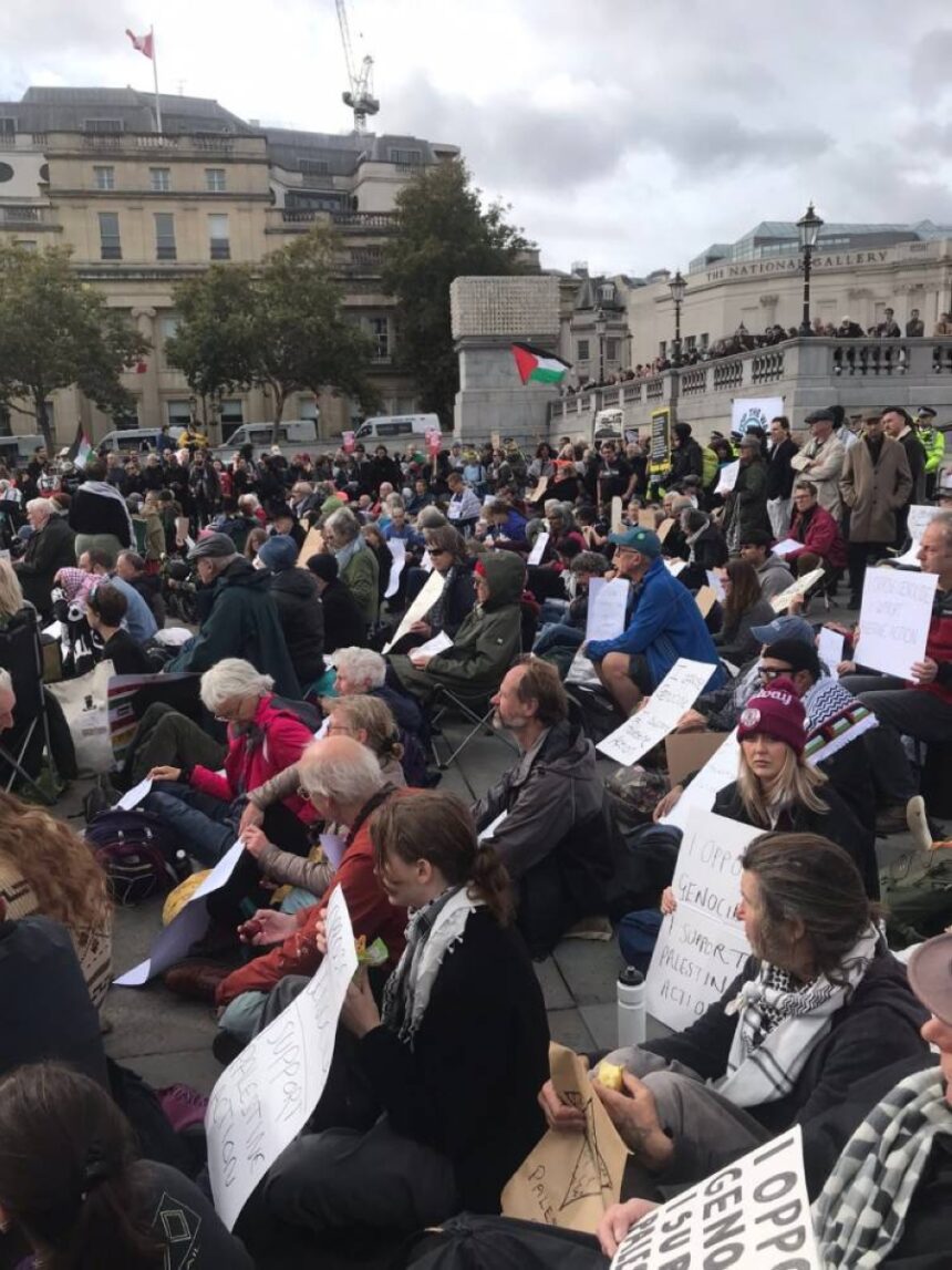 وأكدت الشرطة أن الاحتجاجات، التي نظمتها مجموعة «ديفيند أور جوريز» تجمع نحو 1000 شخص في ترافالغار، حيث كتب المتظاهرون شعارات على لافتات شخصية قبل الجلوس سلمياً، لكنها تحولت إلى اعتقالات جماعية بعد رفض الشرطة السماح بعرض الدعم للمجموعة، مع حمل بعض المتظاهرين، بمن في ذلك كبار السن، بعيداً عن الميدان.