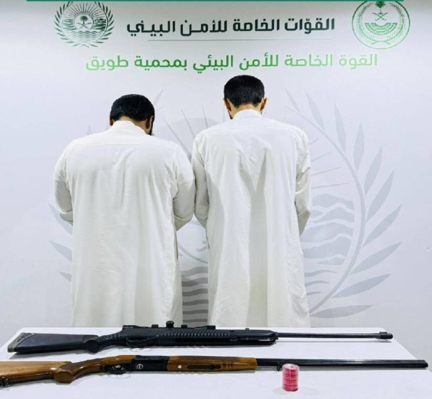 ضبطت دوريات القوات الخاصة للأمن البيئي مواطنين مخالفين لنظام البيئة، لارتكابهما مخالفة الشروع في الصيد، دون ترخيص في محمية طويق الطبيعية، بحوزتهما بندقية شوزن وبندقية هوائية و(400) ذخيرة هوائية، وطُبقت الإجراءات النظامية بحقهما.