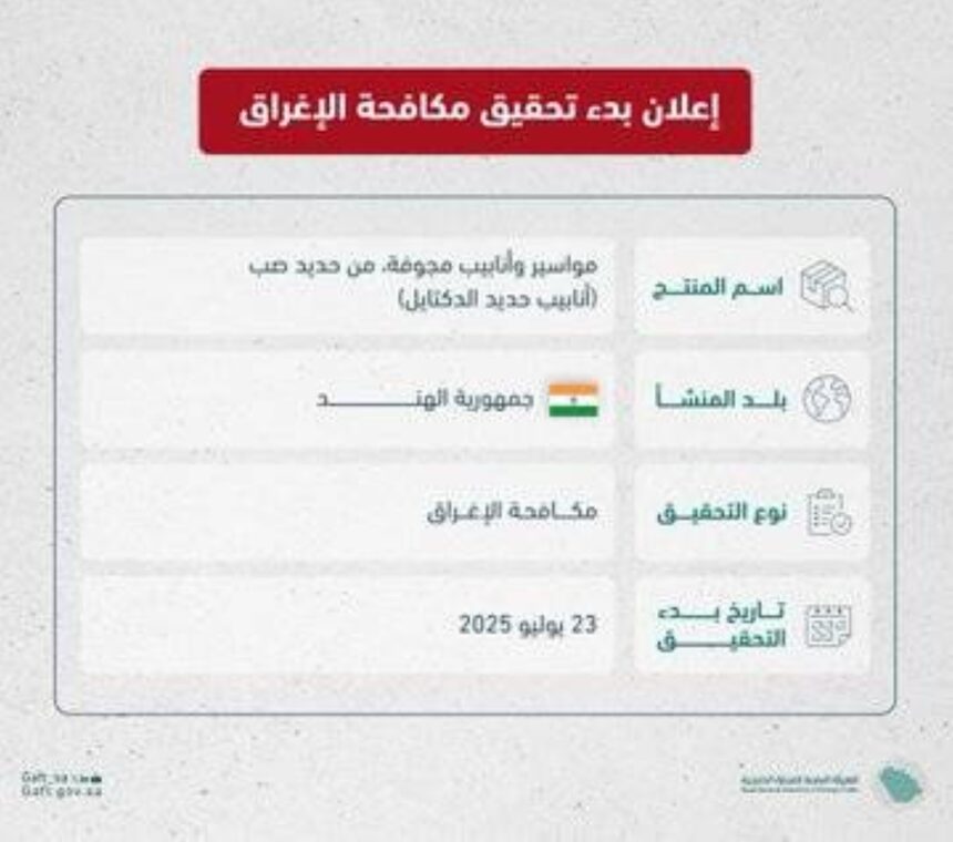 Reading: «التجارة الخارجية»: بدء تحقيق مكافحة الإغراق ضد واردات المملكة من منتج (أنابيب حديد الدكتايل) من الهند – أخبار السعودية – ن والقلم