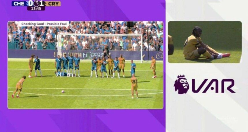 استدعى حكام تقنية الفيديو في مباراة تشيلسي وكريستال بالاس الحكم دارين إنجلاند؛ لمراجعة هدف اللاعب إيبيريشي إيزي في مرمى الحارس روبرت سانشيز، الذي تم إلغاؤه، بداعي المخالفة على مارك جويهي، بعد أن ترك مسافة أقل من متر واحد عن الحائط البشري، وهذه الحالة التحكيمية التي صاحبها كثير من الجدل لندرة حدوثها وعدم تكرارها في المنافسات الكروية، وهذا ما أوضحه المستشار التحكيمي المصري لـ«عكاظ» طارق سامي، إذ قال: قرار الحكم دارين إنجلاند كان صحيحاً بإلغاء الهدف. مشيداً بحكم الفار الذي استدعى حكم الساحة لمراجعة الهدف قبل تأكيد احتسابه.