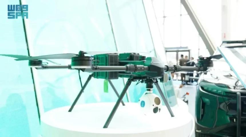 The Ministry of Interior’s Security Capabilities Agency showcases the long-range winged aircraft for executing security missions in wide operational areas to visitors at the Ministry of Interior’s pavilion at the World Defense Exhibition 2026. The aircraft aims to carry out reconnaissance and aerial surveillance of vast areas, monitoring and follow-up, and supporting search and rescue operations.