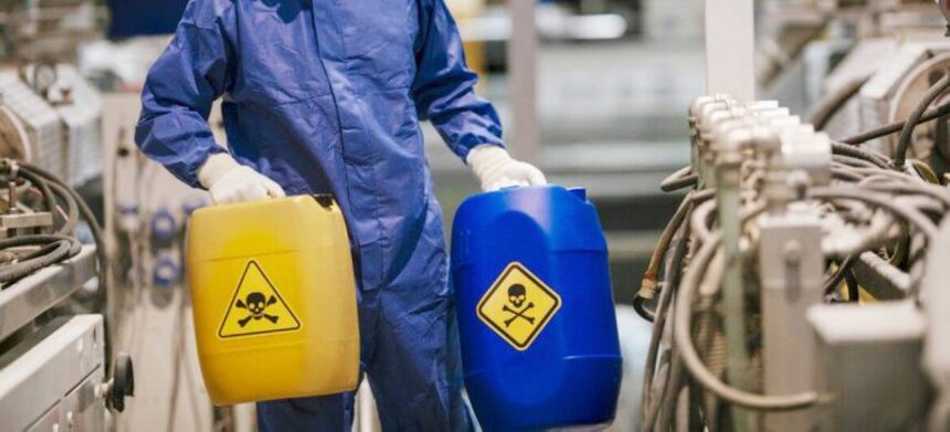 ويُمنع منعاً باتاً خلط المواد الكيميائية أو نقلها أو تعبئتها في أوعية أخرى إلا باستخدام عبوات مناسبة وأدوات مخصصة، وإعادة التعبئة في عبوات سبق استخدامها مرة واحدة، كما يجب وضع بطاقة تعريفية تبين اسم المادة الكيميائية واسم الشركة المصنعة وتاريخ الإنتاج وتاريخ الانتهاء، مع تخزينها بعيداً عن أماكن تصنيع الأغذية والأدوية والمشروبات، ووضعها داخل أوعية محكمة الإغلاق، محمية من الكسر أو التلف، وتوضع داخل حاويات ثانوية (Secondary Containment) لمنع تسربها خارجها، وتوفير أوعية مناسبة لتجميع المواد المنسكبة، على أن تكون الأوعية المستخدمة في نقل المواد الكيميائية مزودة ببطاقات تعريفية توضح محتواها، على أن يكون موقع التخزين بعيداً عن مناطق التجمعات السكنية أو المدارس أو المستشفيات أو الأسواق، ويكون ذلك في مكان خاص مستقل خارج المدن.
