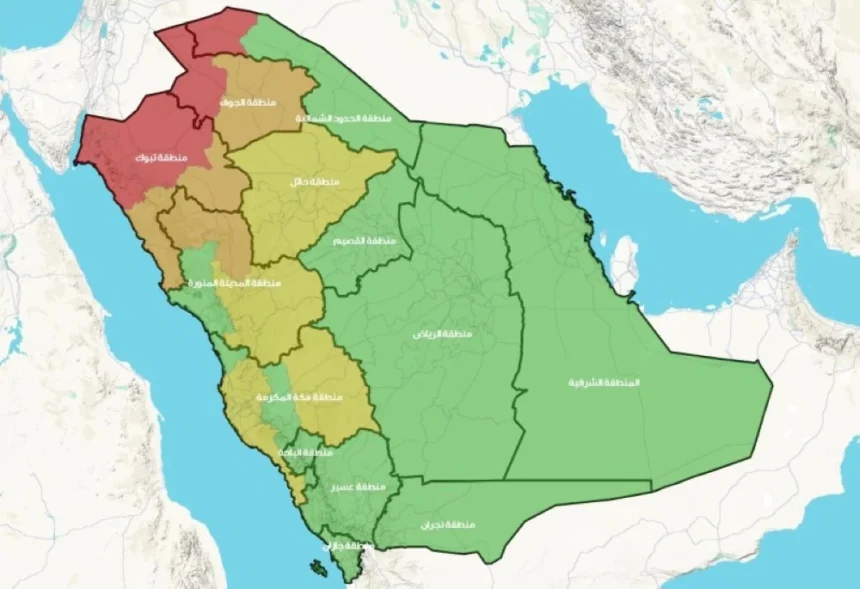 The General Directorate of Civil Defense has issued a detailed map of the heavy rainfall situation that begins today (Saturday) and will continue for 6 days over wide areas of the Kingdom. It indicated that the Makkah region will be one of the most affected by moderate to heavy rains, which may cause flash floods and hail, in addition to descending winds that stir up dust and sand.