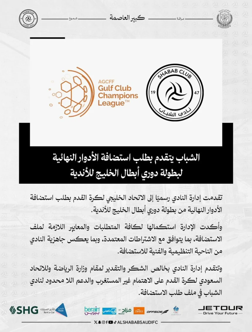 The Al-Shabab Club submitted an official request to the Gulf Football Federation to host the final stages of the Gulf Clubs Champions League, in a move that reflects the club’s ambition to enhance its presence at the international level. The club’s management confirmed that it has completed all the necessary requirements and standards for the hosting file, in accordance with the conditions approved by the organizing body, pointing to the readiness of the infrastructure and the organizational and technical capabilities that the club possesses to host this major Gulf event.