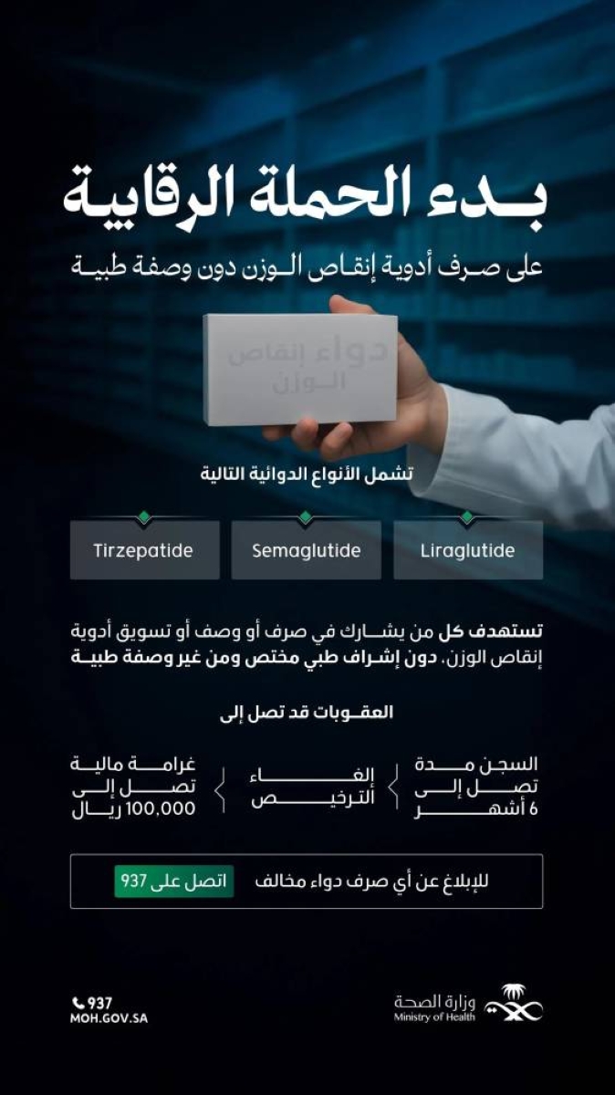 أطلقت وزارة الصحة حملتها الرقابية على مخالفة صرف أدوية إنقاص الوزن دون وصفة طبية، وذلك ضمن جهودها في الرقابة على الأدوية الوصفية، تعزيزًا لسلامة المرضى، والحد من المخاطر الصحية الناجمة عن الممارسات غير المهنية في صرف الأدوية، وضمان التزام الممارسين الصحيين والمنشآت الصيدلانية بالأنظمة المعتمدة للحفاظ على صحة المستفيدين.
