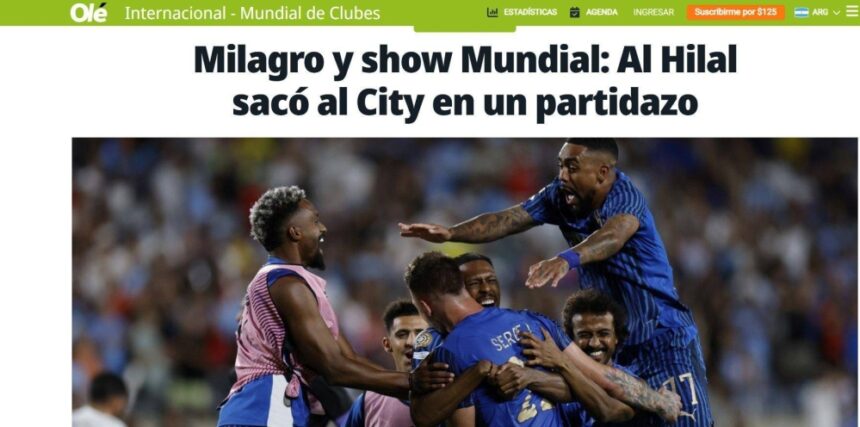 أشادت الصحف والمواقع العالمية بالفريق الهلالي بعد الانتصار التاريخي على مانشستر سيتي الإنجليزي بنتيجة (4-3)، في المباراة التي أُقيمت على ملعب «كامبنغ وورلد» في مدينة أورلاندو الأمريكية، في ثمن نهائي بطولة كأس العالم للأندية 2025. وبهذا الفوز يصبح الزعيم ضمن أفضل ثمانية أندية في العالم، وفور انتهاء هذا اللقاء أخذت المواقع والصحف العالمية تنشر عبارات الثناء والمديح بهذا الإنجاز التاريخي للفريق الهلالي.