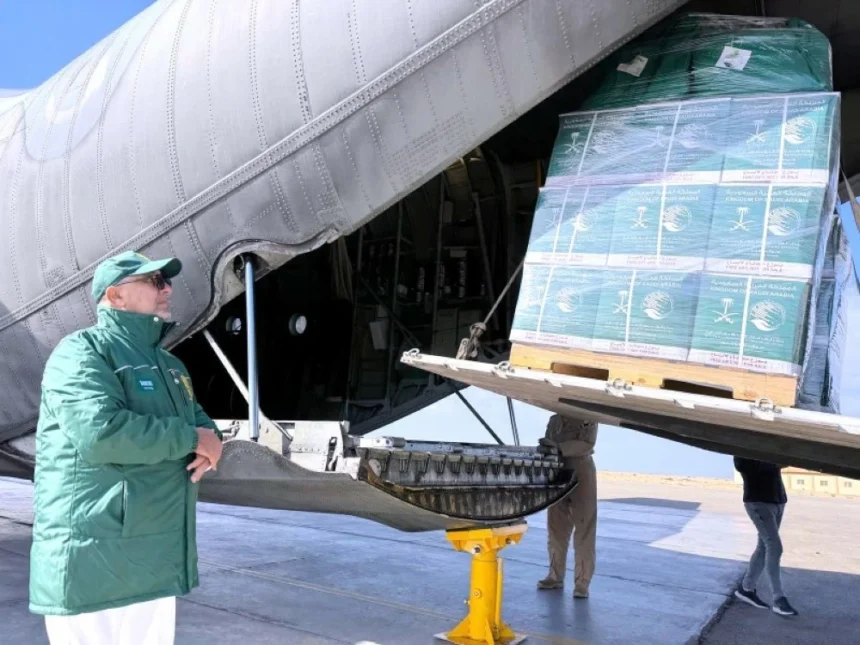 The 77th Saudi relief plane, operated by the King Salman Humanitarian Aid and Relief Center, arrived yesterday at Al-Arish International Airport in the Arab Republic of Egypt, in coordination with the Ministry of Defense and the Saudi Embassy in Cairo.