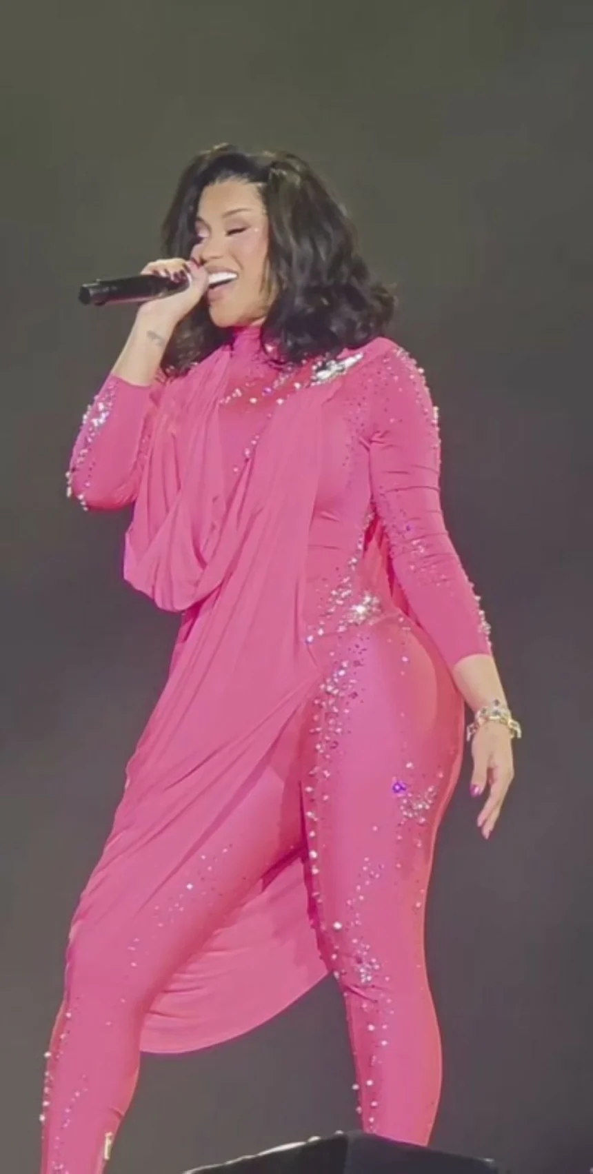 جاءت القطعة التي ظهرت بها كاردي بي بلون فوشي لافت يعكس جرأة واضحة وحضورًا مسرحيًا قويًا يتناسب مع طبيعة العروض الحيّة. التصميم اعتمد على خامة مرنة تحتضن القوام بانسيابية، مع تطريزات لامعة متناثرة بعناية على امتداد القطعة، ما أضفى بعدًا بصريًا متحركًا يتفاعل مع الإضاءة على المسرح ويعزز من قوة اللون وحيويته.