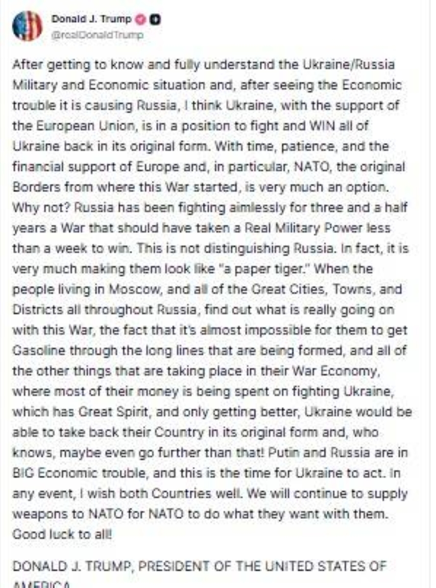 جاء ذلك ردا على تصريحات ترمب التي شككت في القدرات العسكرية والاقتصادية لروسيا، مدعيا أن أوكرانيا قادرة على استعادة أراضيها بدعم من الناتو وأوروبا.