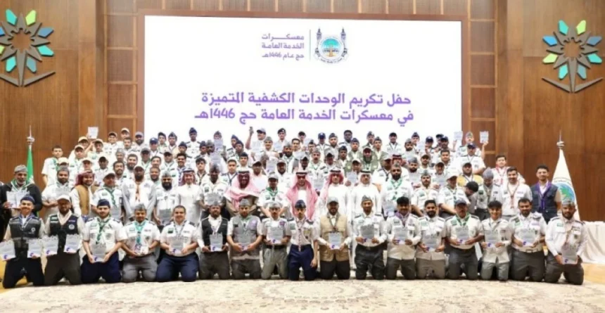 The Saudi Arabian Scout Association held a honoring ceremony for the distinguished scouting units in the public service camps for the Hajj season of 1446 AH, at the theater of the Technical College in Riyadh, in the presence of the General Supervisor of the camps, the Deputy Chairman of the Association, Dr. Abdulrahman bin Ibrahim Al-Mudayris, along with several officials from the scouting sectors.