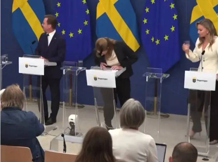 في مقطع فيديو مؤثر، ظهرت الوزيرة لان التي تسلمت منصبها أخيرا في حكومة رئيس الوزراء أولف كريسترسون، وهي تقف بهدوء تستمع لأحد المتحدثين. وفجأة بدأت تفقد توازنها ببطء قبل أن تسقط بقوة على الأرض، ما أدى إلى سقوط المنصة الشفافة أمامها.