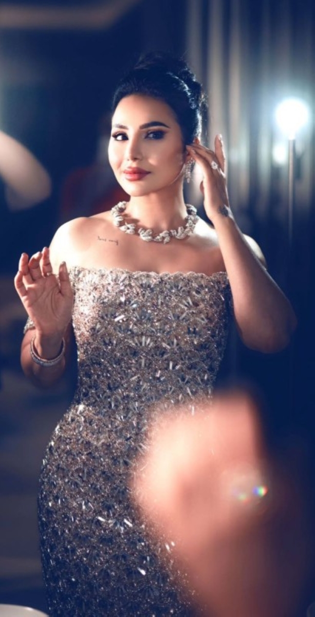الفستان الذي تميّز بقصّته الضيّقة انسدل بانسيابية راقية عكست رشاقتها وأناقتها، فيما زيّنته مجوهرات ماسية فخمة تناغمت مع طابع المناسبة الباذخ. اعتمدت لجين تسريحة شعر مرفوعة كلاسيكية، ومكياجاً ناعماً بلمسات لامعة أبرزت إشراقتها، لتبدو بإطلالة تجمع بين البساطة والرقي في آن واحد.