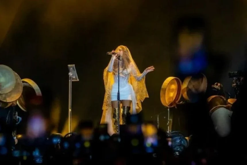 This visual transformation, from the white veil to the sparkling gold, embodied a complete artistic narrative that combined delicacy and performance, a characteristic that has always distinguished the shows of the “Queen of the Stage.” Myriam Fares once again confirmed that her presence on stage is not limited to singing but extends to creating a complete visual scene that captures attention and is etched in the audience’s memory.