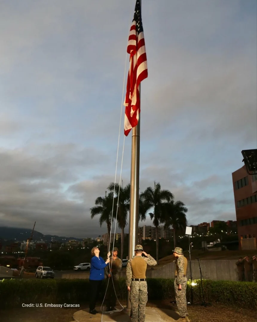 وقادت مراسم الإنزال السابق والرفع الحالي لورا دوغو، القائمة بأعمال السفارة الأمريكية في فنزويلا، وأكدت في بيان نشرته السفارة على منصة «إكس» أنه «في صباح 14 مارس 2019، أُنزل العلم الأمريكي للمرة الأخيرة في سفارة الولايات المتحدة في كاراكاس، واليوم، 14 مارس 2026، في التوقيت نفسه، قام فريقي وأنا برفع العلم الأمريكي».