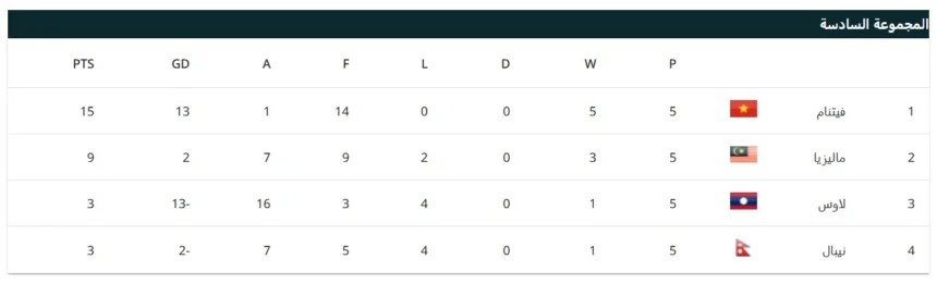 The disciplinary decision issued by the Asian Football Confederation resulted in the matches being converted to losses for Malaysia with a score of 3-0, which placed them six points behind Vietnam, the leader of Group 6, and eliminated any mathematical possibility of qualification, with one match remaining in the qualifiers. The new standings of the group are as follows: Vietnam in first place with 15 points, followed by Malaysia in second with 9 points, and then Laos and Nepal with 3 points each. Vietnam will host Malaysia in a match that is a formality after securing qualification for the finals.
