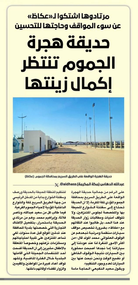 جاء ذلك تعقيباً على ما نشرته «عكاظ»، بشأن الملاحظات المتعلقة بحديقة الهجرة في المحافظة تحت عنوان (حديقة هجرة الجموم تنتظر إكمال زينتها) الذي نشر الثلاثاء الموافق للخامس من أغسطس الجاري.