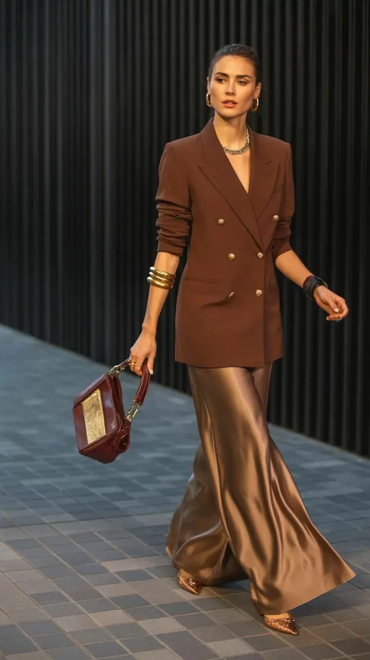 The satin pants are making a striking presence in the contemporary fashion scene, as this shiny fabric has returned to occupy a prominent place in both daily and evening looks alike. Satin is no longer reserved for formal occasions or sleepwear; it has become an essential element in the wardrobe of the modern woman, thanks to its ability to blend comfort and luxury simultaneously.