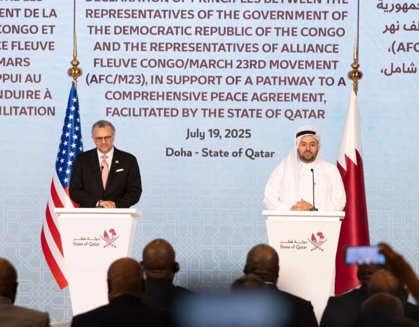وأشار وزير الدولة بوزارة الخارجية القطرية محمد الخليفي، إلى التزام قطر بدعم مسارات الحل السياسي بالتنسيق مع الاتحاد الأفريقي، وبما يكمّل التقدم المحرز بتوقيع اتفاق السلام بين حكومتي الكونغو الديمقراطية ورواندا في واشنطن بتاريخ 27 يونيو الماضي، موضحاً أن الإعلان يمثل خطوة مفصلية في طريق ترسيخ السلام والاستقرار في شرق جمهورية الكونغو الديمقراطية، كونه يمهد لبدء مفاوضات مباشرة نحو سلام شامل يعالج جذور النزاع، معرباً عن ثقته في التزام الطرفين بالاتفاق.