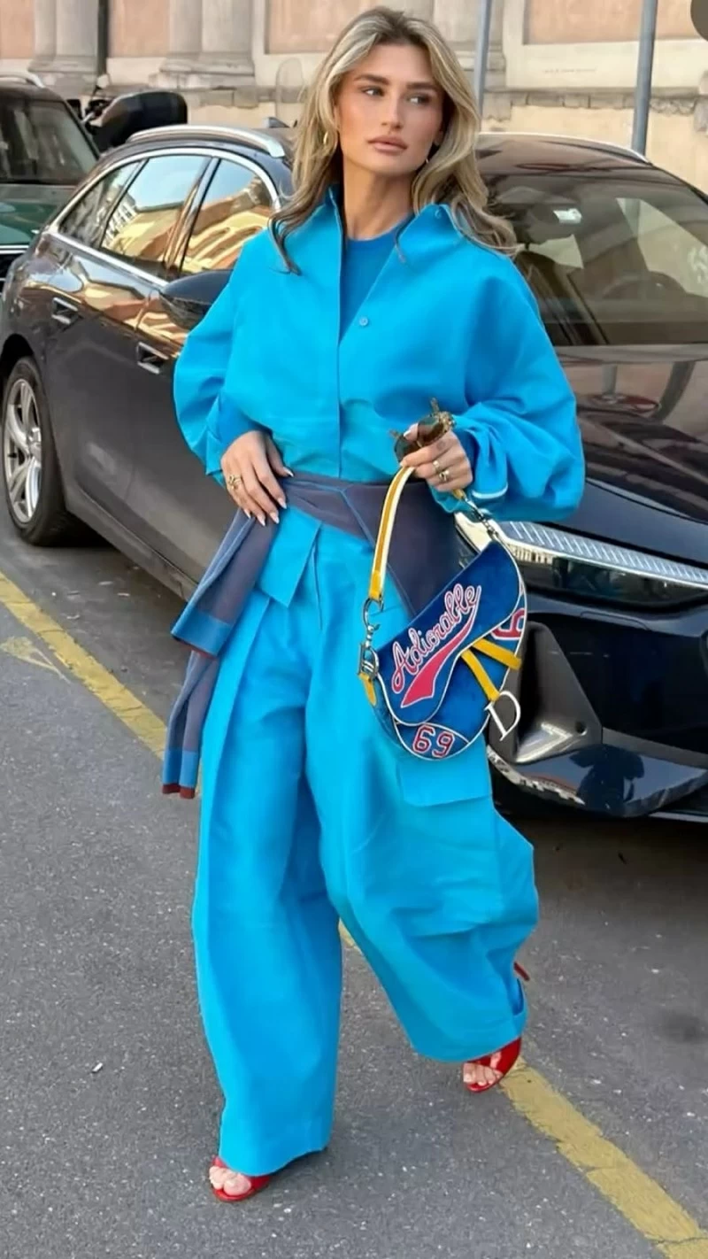 In complete looks, it is advisable to avoid uniformity in color shades entirely, replacing it with different shades of blue or introducing complementary color elements through shoes or bags, which enhances the depth of the outfit and gives it a richer visual dimension.