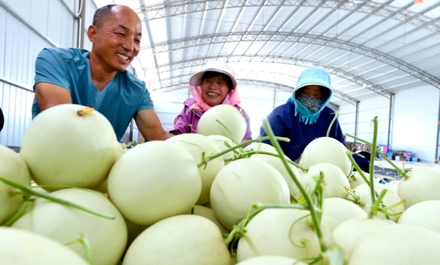 في منطقة زراعة البطيخ العسلي، التي تبلغ مساحتها 1000 هكتار في قرية تشنغهاو، بمقاطعة جاوتاي، في الصين، يقوم مزارعو البطيخ بجمع 60 طناً من البطيخ العسلي للتجار من بكين داخل البيوت الزجاجية. وفي الصورة مزارعون يجمعون كميات من البطيخ. (إيكونومي دايلي الصينية)