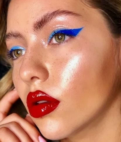 The success of blending blue and red relies on achieving a precise visual balance, as it is preferable to use one of the colors as a primary element while the other serves as a complementary touch. For example, one can opt for blue eyeshadow with classic red lips for a strong and direct look, or use blue eyeliner with soft red gradients around the eyes to create a more modern and softer appearance.