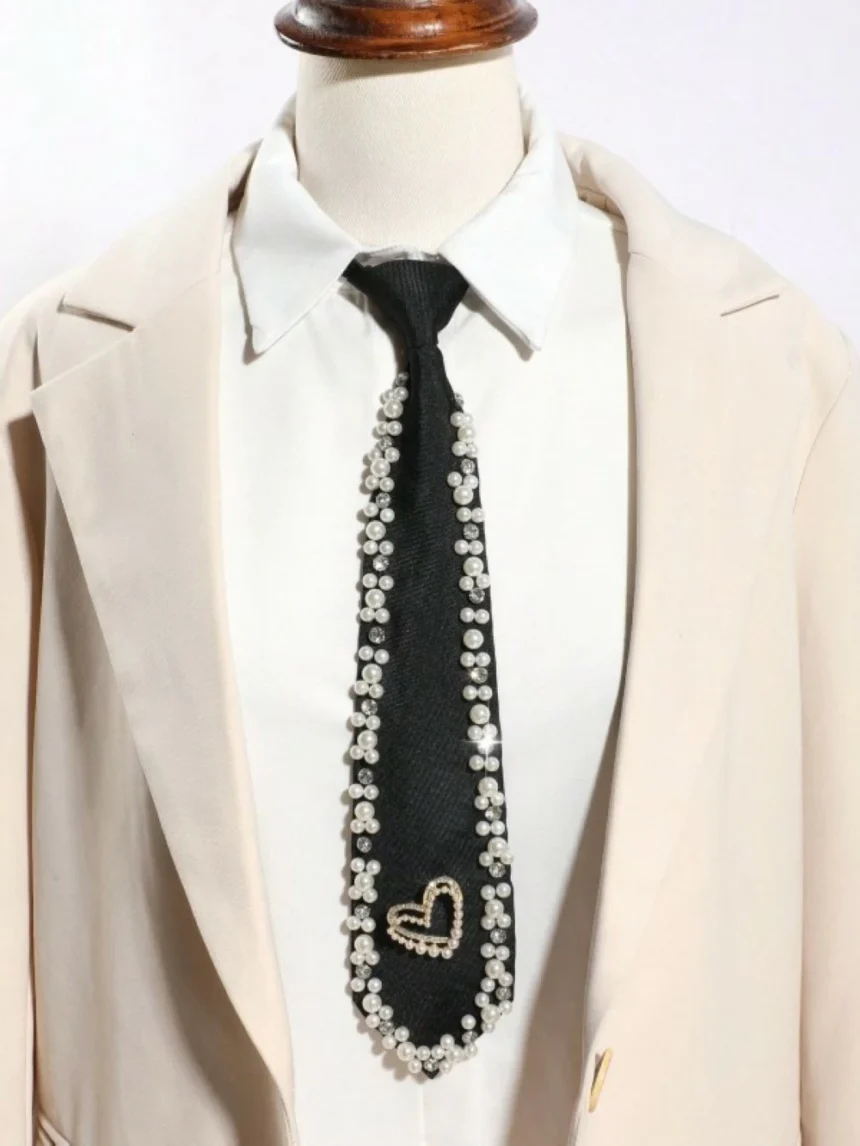 The embroidered tie gives women the opportunity to experiment with a style that balances sophistication and uniqueness, making the look eye-catching without being excessive.