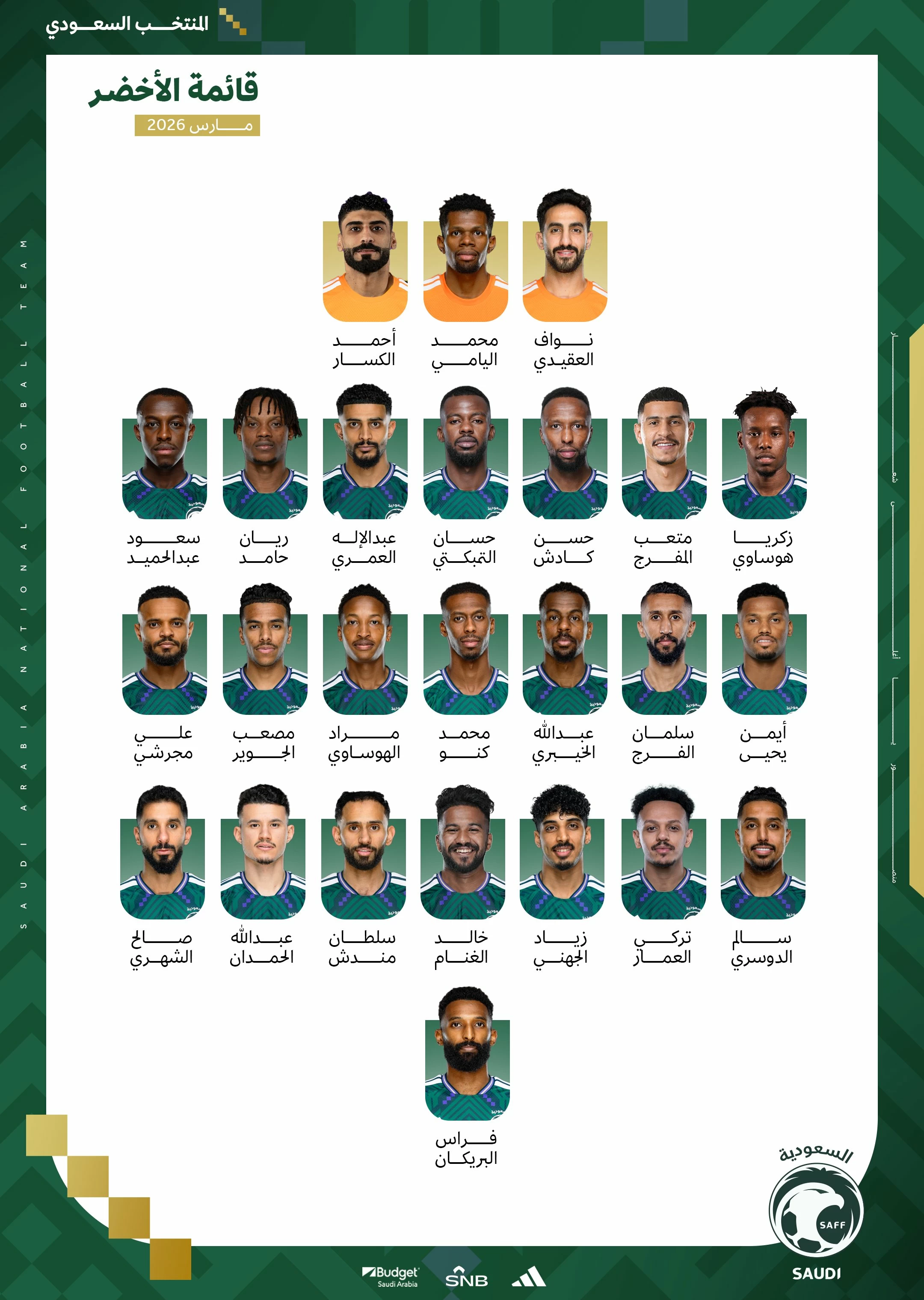 أعلن المدير الفني للمنتخب الوطني الأول إيرفي رينارد قائمة الأخضر المشاركة في المعسكر الإعدادي الذي سيُقام خلال فترة أيام FIFA الدولية لشهر مارس، وذلك ضمن المرحلة الثالثة من برنامج إعداد الأخضر لكأس العالم FIFA 2026.
