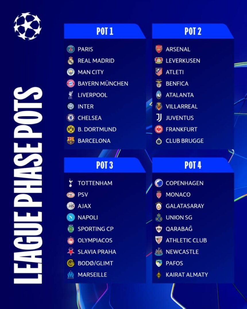 تسحب مساء اليوم (الخميس)، قرعة الدور الأول من نسخة دوري أبطال أوروبا 2025-2026، في مدينة موناكو الفرنسية، بمشاركة 36 فريقاً، للموسم الثاني على التوالي، بعد تطبيق النظام الجديد، إذ سيخوض كل فريق 8 مباريات في الدور الأول، 4 على أرضه و4 خارجها شرط أن لا يتواجه فريقان من نفس البلد في مرحلة الدوري، وسيتم تقسيم الفرق لـ4 مستويات تصنيفية، إذ يلعب كل فريق مباراتين ضد فرق من كل مستوى وفق القرعة، وبعد مرحلة الدوري، يتأهل أصحاب المراكز 1-8 مباشرة لدور الـ16، فيما يخوض أصحاب المراكز 9-24 ملحقاً لتحديد 8 فرق أخرى، وفق التقرير الذي بثه موقع الـ«RT» الإلكتروني، وسيكون تصنيف الفرق على النحو التالي: