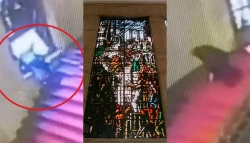 The footage recorded by the hall’s cameras shows politician Cani attempting to regain his balance before stumbling and colliding with the ornate window, which resulted in its breaking at a moment that shocked the attendees, who turned towards the sudden sound of shattering glass.
