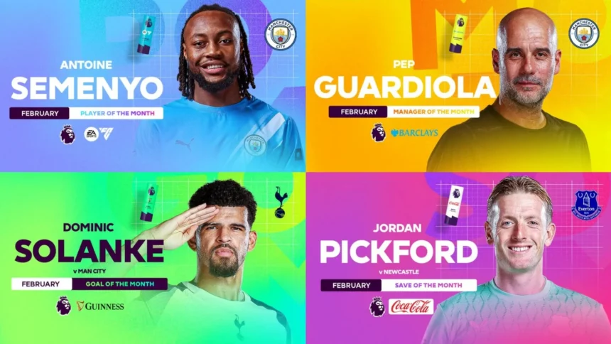 وحصد مدرب مانشستر سيتي بيب غوارديولا جائزة أفضل مدرب لشهر فبراير، وهي المرة الأولى التي يفوز فيها منذ أكثر من 4سنوات.