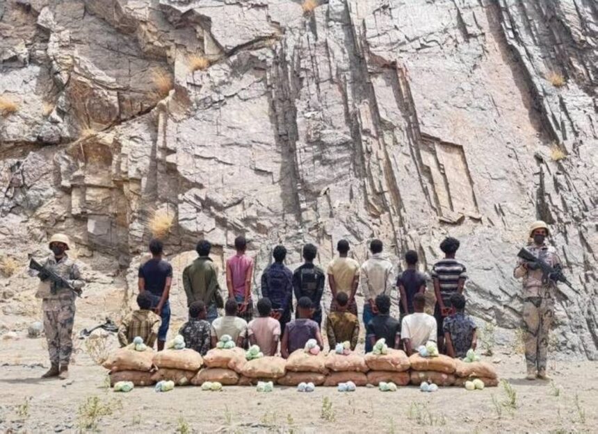 قبضت الدوريات البرية لحرس الحدود في قطاع الربوعة بمنطقة عسير على (18) مخالفًا لنظام أمن الحدود من الجنسية الإثيوبية، لتهريبهم (270) كيلوجرامًا من نبات القات المخدر، وجرى استكمال الإجراءات النظامية الأولية بحقهم، وتسليمهم والمضبوطات لجهة الاختصاص.
