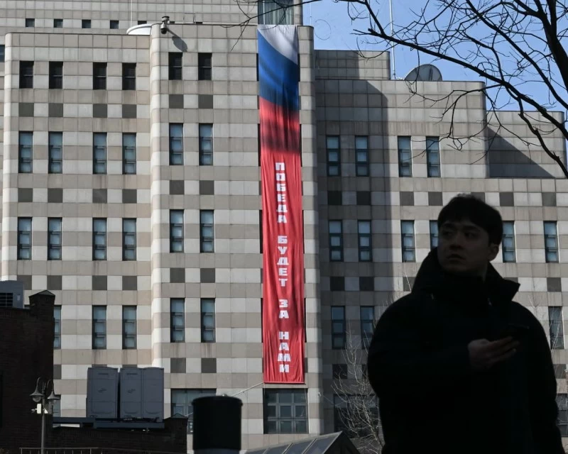 وأشارت التقارير إلى أن العبارة استخدمها الاتحاد السوفيتي خلال الحرب العالمية الثانية، فيما لم تقم السفارة الروسية بإزالة اللافتة حتى الآن.