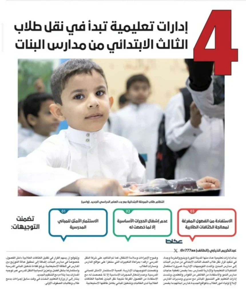 “Okaz” published on 6 Rabi’ Al-Thani 1447, that several educational administrations began implementing similar steps by transferring third-grade elementary students from girls’ schools to boys’ schools.