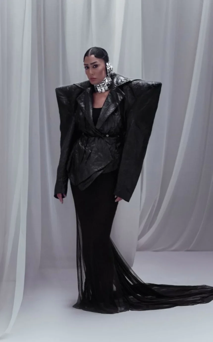 غادة عبد الرازق ظهرت في أحدث جلسة تصوير بإطلالة سوداء غريبة وغير تقليدية ارتدت ثوبا أسود مع جاكيت جلد بأكتاف كبيرة وتنورة ضيقة وطويلة ذات جزء شفاف. وأضفت إكسسوارات فضية بارزة وتسريحة شعر مبلل مع مكياج قوي لإبراز الحدة والجرأة.