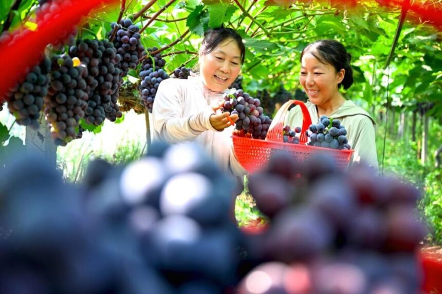 يدخل محصول العنب في مزارع منطقة كياوتشنغ، التابعة لمقاطعة آنهوي الصينية موسم الحصاد. وينشغل العمال بالحصاد والفرز والتوريد إلى السوق. وفي الصورة عاملتان أثناء الحصاد. (إيكونومي دايلي الصينية)