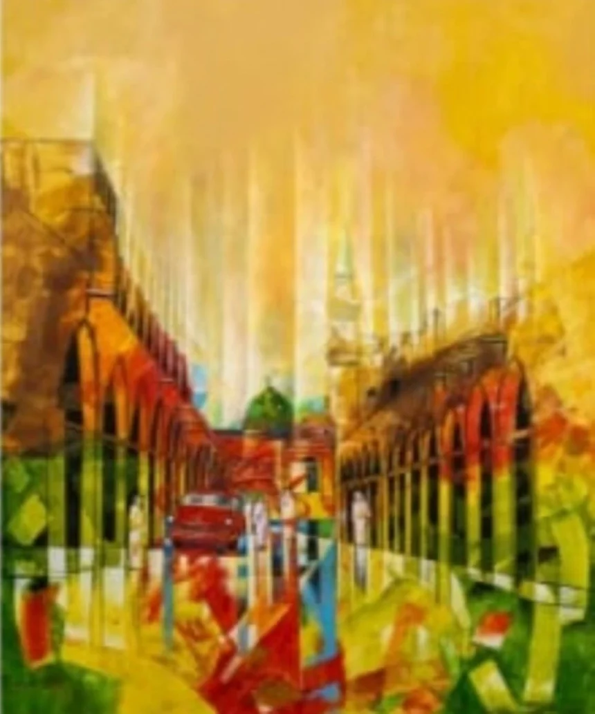 The third place went to the artist Sami Al-Bar, one of the young faces that emerged in the visual arts scene through works inspired by urban life and the movement of people. He won for his piece “The Entrance of Bab Al-Salam via Al-Anbariyah Street,” which offers a modern interpretation of a scene that is emotionally connected to the visitors of the Prophet’s Mosque, where Al-Bar managed to embody movement, light, and the rhythm of the place in a dynamic style that combines technical skill and spiritual sensitivity.