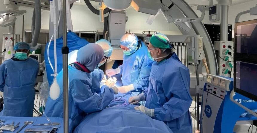 وأفاد أن الفريق الطبي قرر على الفور التدخل بإجراء قسطرة قلب استغرقت نحو أربع ساعات، وقام الجراحون بفتح جراحي 3 سم في أسفل الصدر، وأُجريت القسطرة القلبية، وفتح الغشاء المقفل في صمام الشريان الرئوي بسلك موصول بتيار كهربائي عن طريق جهاز خاص، وتوسيع الصمام بأكثر من بالون، وأسفرت العملية عن تحسن فوري في مستوى الأكسجين ليتجاوز (90%) أثناء العملية.