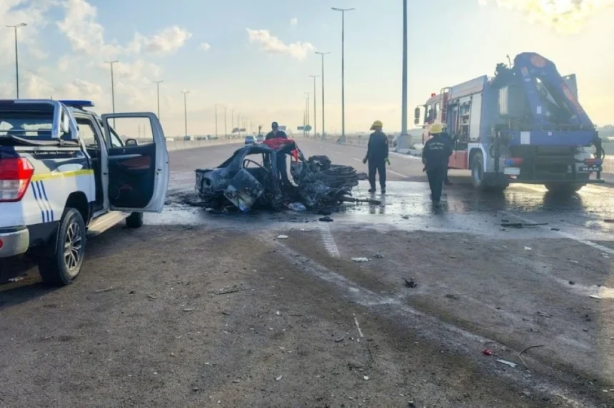 In a tragic incident, the international coastal road west of Alexandria witnessed a horrific car accident yesterday that resulted in a private vehicle catching fire and the death of three individuals, whose bodies were completely burned, in addition to injuring a fourth person in critical condition.