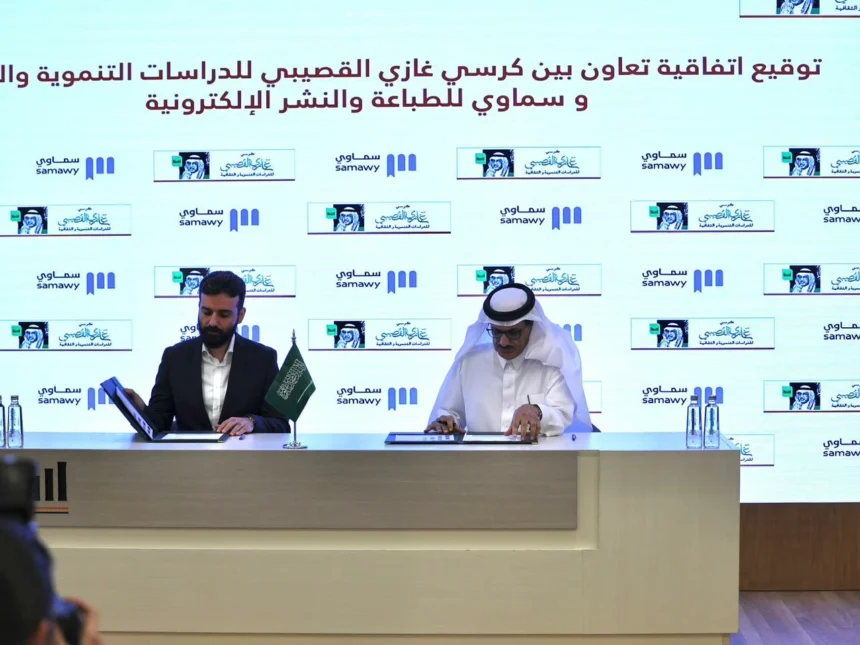 وقّع كرسي غازي القصيبي للدراسات التنموية والثقافية في جامعة اليمامة اتفاقية تعاون مع منصة سماوي، لطباعة ونشر وتوزيع منشوراته علمياً وثقافياً عبر قنوات إلكترونية وورقية وصوتية، بما يسهم في تعزيز انتشار المحتوى المعرفي واستدامته.