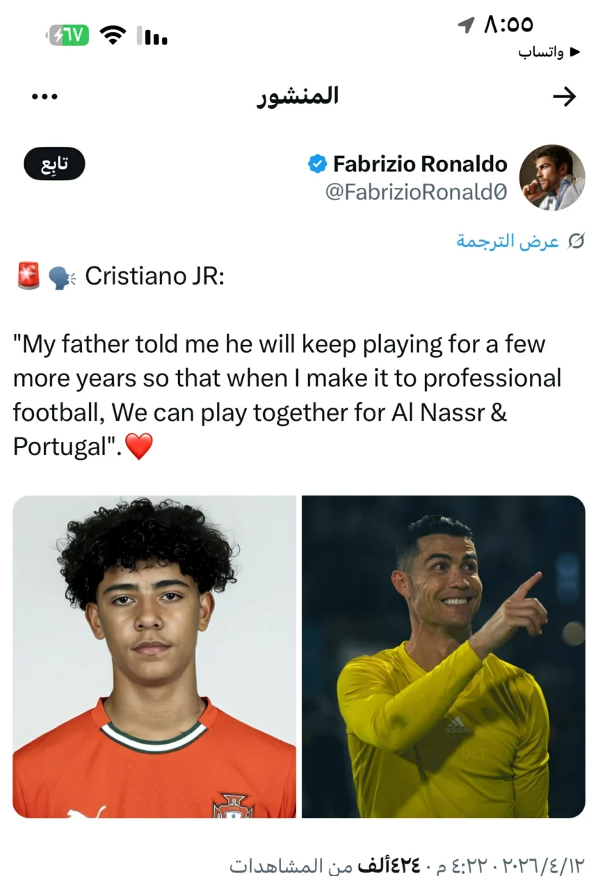 This came in a tweet on his official account on the social media platform “x,” where he said: “My father told me that he will continue to play for a few more years so that we can play together for Al-Nassr and the Portuguese national team when I enter the professional world.”