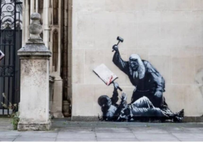 في خطوة جريئة أخرى من الفنان الغامض بانكسي، الذي يُعرف بأعماله السياسية الاستفزازية، ظهرت لوحة جدارية جديدة على واجهة مبنى المحكمة الملكية للعدل في قلب لندن، تصور قاضيا يرتدي الزي التقليدي البريطاني (الباروكة البيضاء والرداء الأسود) وهو يوجه مطرقته بقوة نحو متظاهر من أجل فلسطين ملقى على الأرض يمسك بلافتة مغطاة بدماء.
