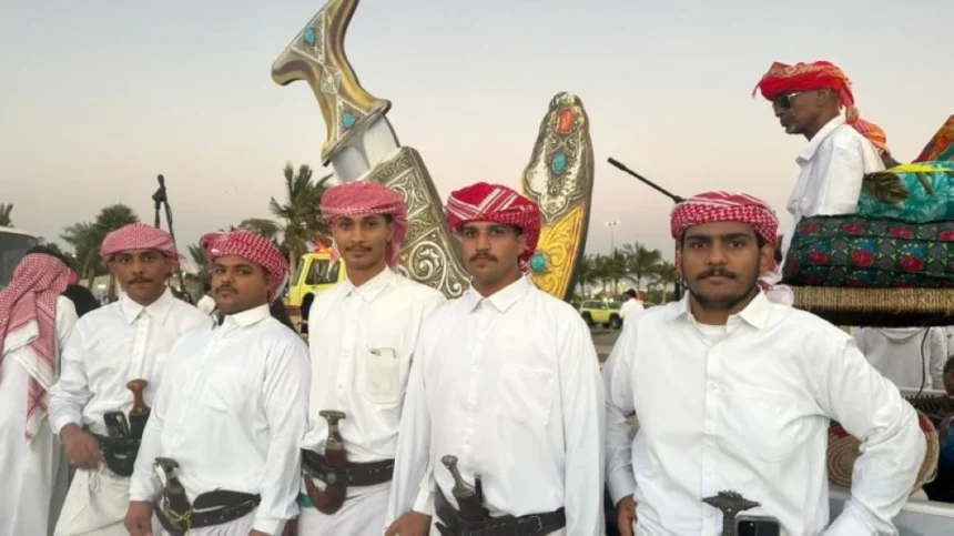 The participation of Al-Harath Governorate in the Jazan Festival was highlighted through the carnival parade, which featured a model of the governorate’s identity (the Southern Khanjar) in its attractive colors, carried on a cart equipped with images that reflect the nature of the place and its people. The participation was accompanied by folk art groups performing the Zamil, Al-Masha, and Al-Mizmar.