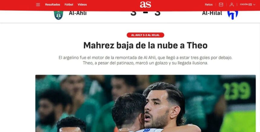 أشادت من صحيفة «آس» الإسبانية، باللاعب الجزائري رياض محرز لاعب الأهلي، بعد مستواه المميز خلال مباراة فريقه الأهلي أمام الهلال، والتي أقيمت على ملعب «الإنماء» في جدة، في قمة الجولة الثالثة من منافسات دوري روشن السعودي.، ولعب محرز دوراً كبيراً في عودة فريقه من الخسارة إلى تعادل مثير، وأسهم بشكل كبير بعودة فريقه إلى المباراة، حيث صنع هدفين في الشوط الثاني لزميليه إيفان توني وميرال، لينتهي هذا اللقاء الكبير والممتع بالتعادل الإيجابي (3-3)، وبعد نهاية اللقاء، حظي محرز بإشادة من صحيفة «آس» الشهيرة للمستوى والأداء الكبير الذي جعل فريقه يعود للتعادل بعد أن كان خاسراً 3 مقابل لا شيء، وكتبت: «رياض محرز يُسقط ثيو من فوق السحاب، وكان صاحب القوة لعودة الأهلي بعد تأخره