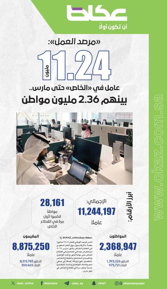 «مرصد العمل»: 11.24 مليون عامل في القطاع الخاص حتى مارس.. بينهم 2.36 مليون مواطن – ن والقلم
